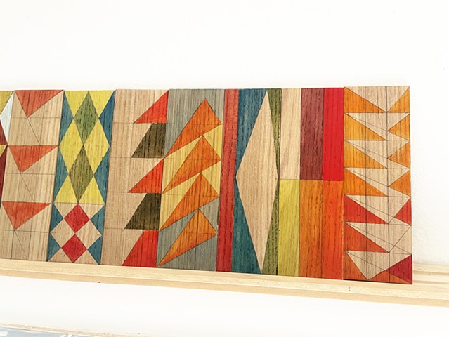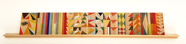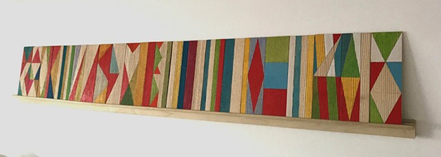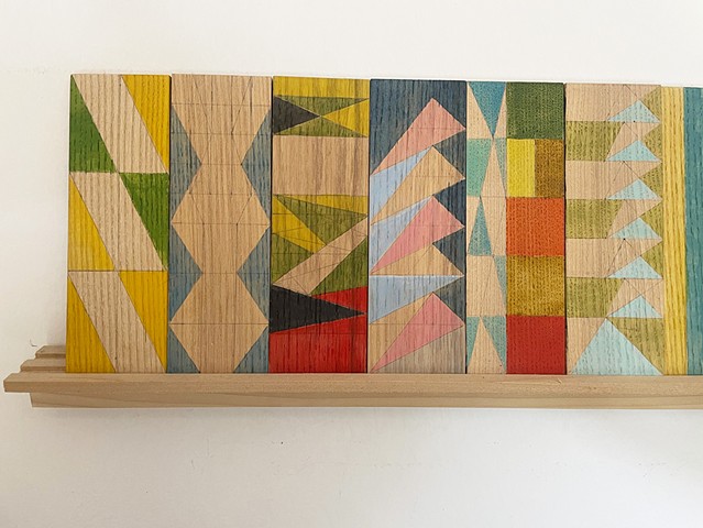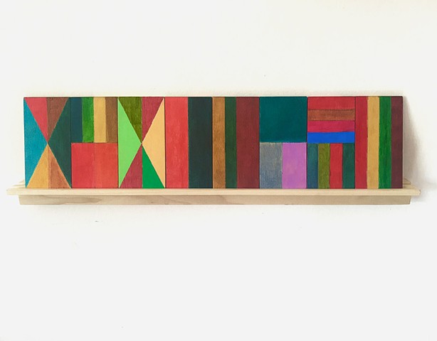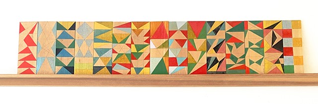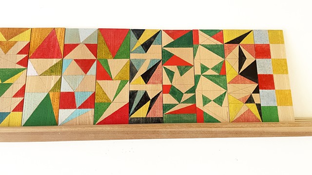 These works are groupings of painted wood tiles arranged on handmade slotted shelves. Each board is painted on both sides. They can be rearranged and flipped over to reveal new compositions.